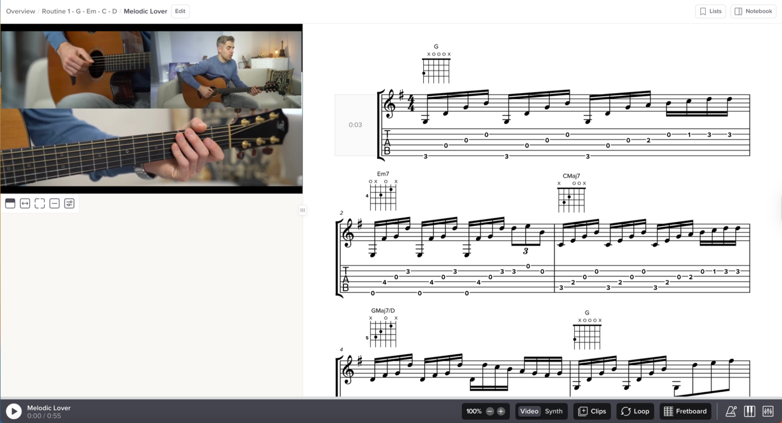 Every routine is carefully organized into 7 progressive levels — Beginner Student, Folk Strumming, Pop Fingerpicker, Melodic Lover, Colorful Guy, Fretboard Master, and Jazz Lover — so you can move step by step, discover new chord shapes, and practice simple drills that make playing feel fun, clear, and achievable.